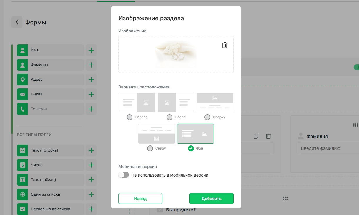 ➔ Поле для имени гостя: тип «Текстовое поле». Отметьте его как обязательное для заполнения, чтобы каждый ответ был подписан именем гостя.