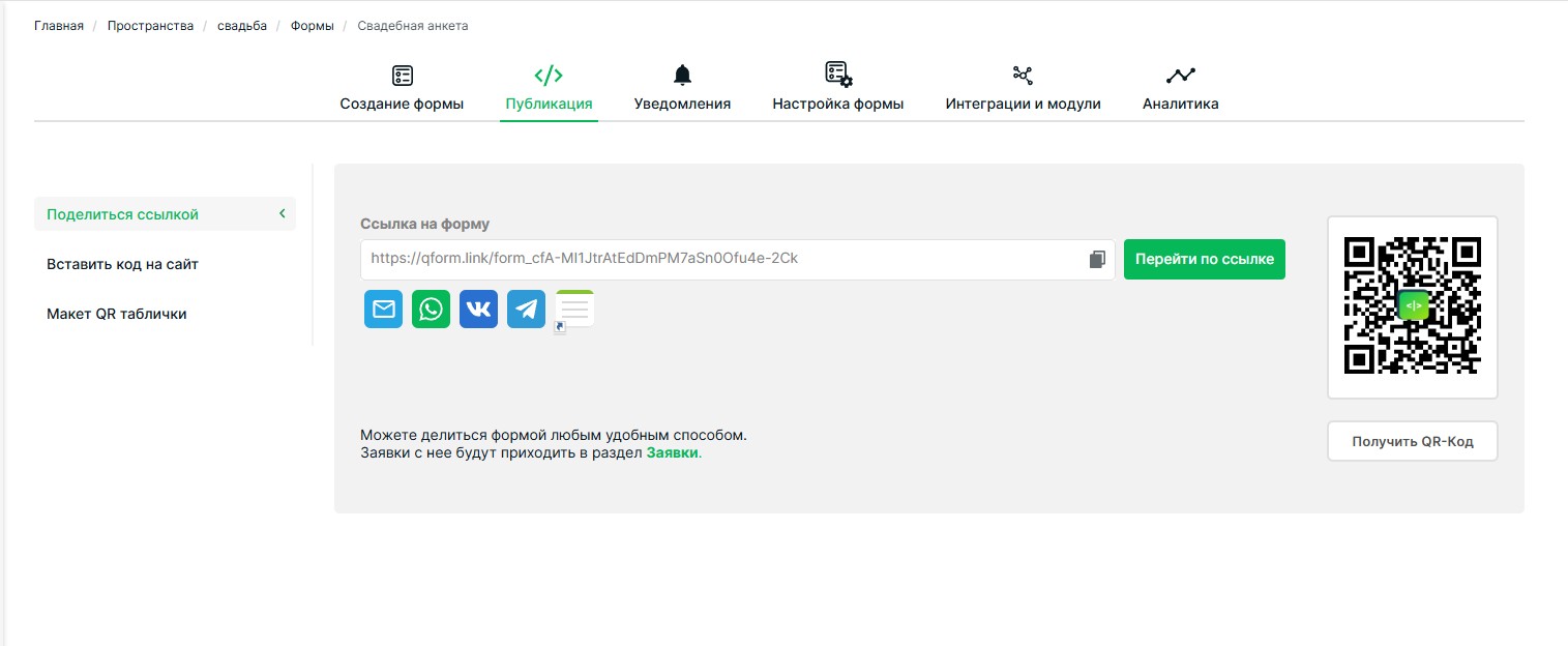 - QR-код на печатном элементе: Если вы всё же готовите небольшие бумажные открытки-пригласительные (например, для старшего поколения родственников), добавьте на них QR-код, ведущий на вашу онлайн-форму. Гость сможет отсканировать код камерой телефона и сразу открыть страницу приглашения. В QForm есть функция генерации QR-кода для ссылки формы, ею стоит воспользоваться.