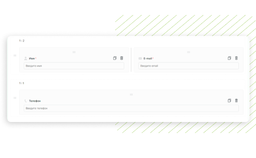 Конструктор режимінде атау және E-mail өрістерін бір жолға орналастырыңыз. Оларды міндетті түрде толтырыңыз. Төменде Телефон өрісін қосыңыз