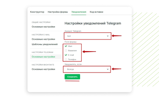 Тізімнен қажетті есептік жазбаны таңдап, хабарларда көрсетілетін өрістерді белгілеңіз. Хабарландыру уақытын орнатыңыз: әрқашан пішінді жібергеннен кейін немесе өтініш өңдеуге қабылданбаған кезде уақыт бойынша