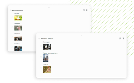 Өріс түрлерін қосу және конфигурациялау: «Тізімнен жалғыз» немесе «Тізімнен бірнеше» өрістерін қосыңыз. Тақырып беріңіз, абзацтарды жауап опцияларымен аяқтаңыз және суреттерді тіркеңіз. Біздің мысалда ыңғайлы болу үшін клиент фотосессия үшін нақты формат пен орынды таңдайды