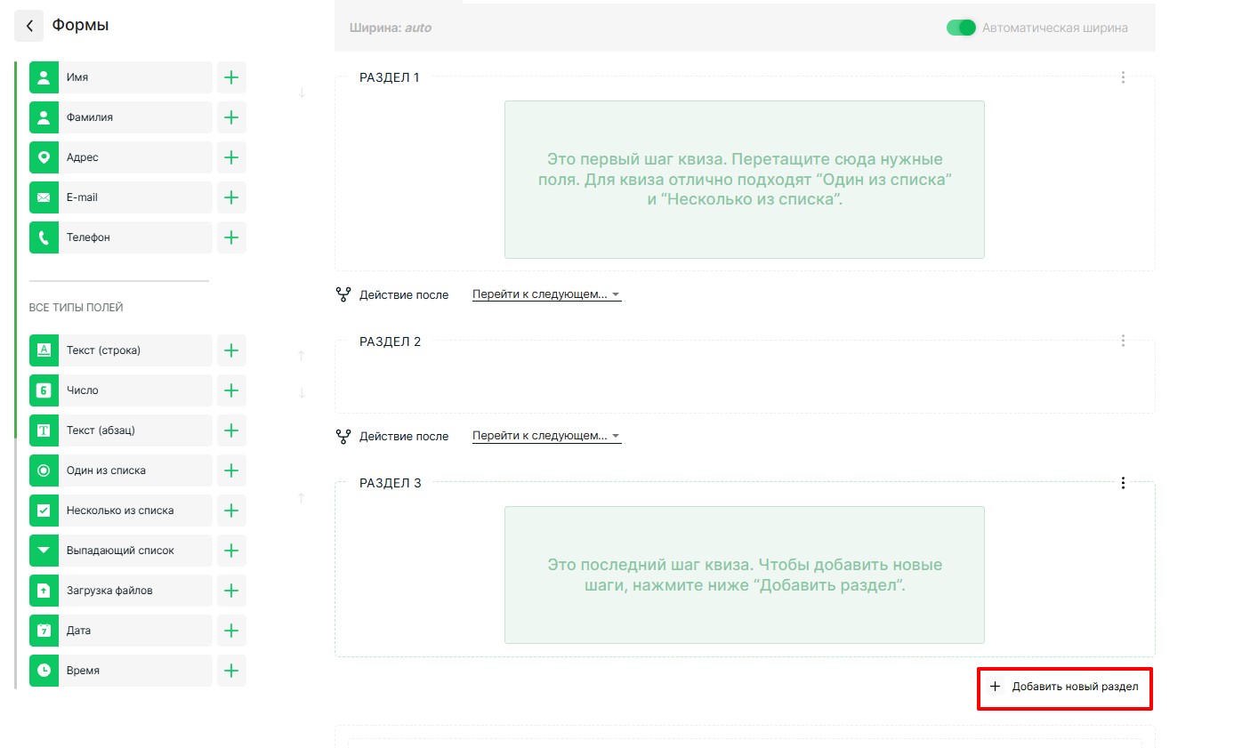 Дизайнерде логикалық ауысуларға рұқсат беру үшін кемінде үш бөлім жасаңыз.