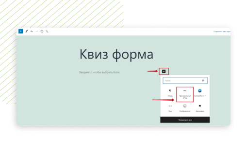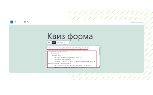 “Мәтіндік блокты” орналастырыңыз. Өріс HTML тегтерін қолдайды, олардың көмегімен викторинаның бастапқы және аяқталу беттерін жобалау үшін элементтерді (тақырыптар, суреттер, GIF файлдары) қосуға болады