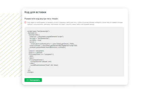 Параметрлер қойындысына өтіп, қою коды бөлімін ашып, сценарийді көшіріп, тегтің ішіндегі сайтқа қойыңыз барлық параметрлерден кейін сайтта